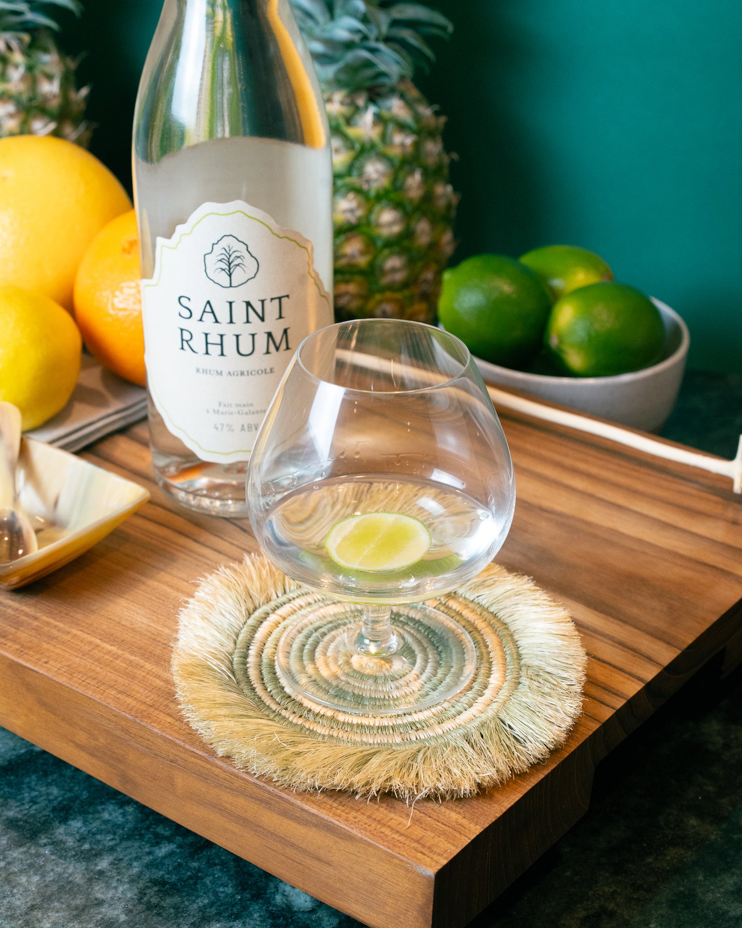 Stir, swizzle, muddle, or mix the lime juice, lime wheel, and honey. Add Saint Rhum on top. Ice is optional, but generally frowned upon.